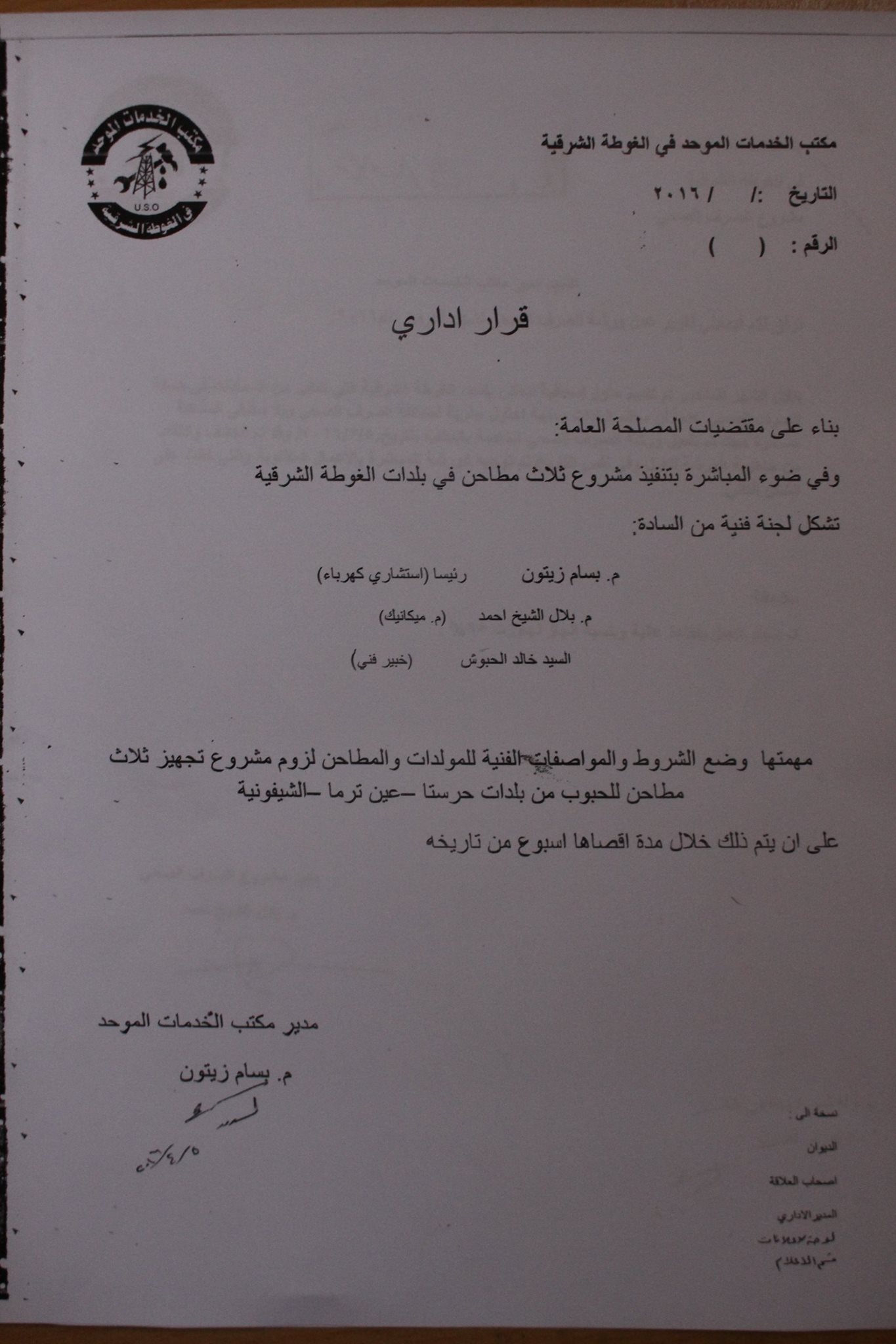 وفي ضوء المباشرة بتنفيذ مشروع ثلاث مطاحن في بلدات الغوطة الشرقية تشكل لجنة فنية من السادة :