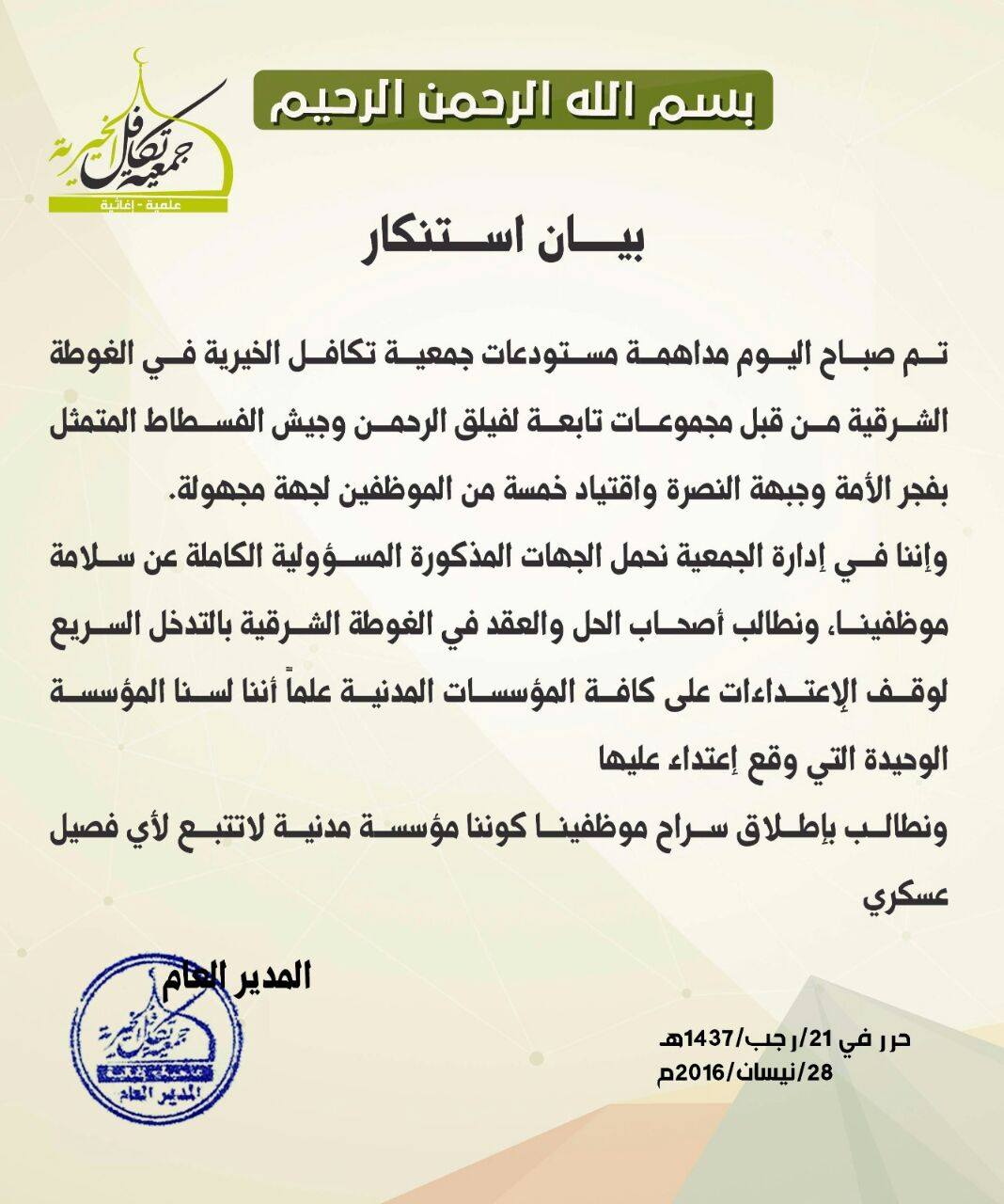 بيان إدانة من الهيئة العامة لتنسيق العمل الإغاثي في الغوطة الشرقية للإعتداء الذي حصل على جمعية تكافل الخيرية