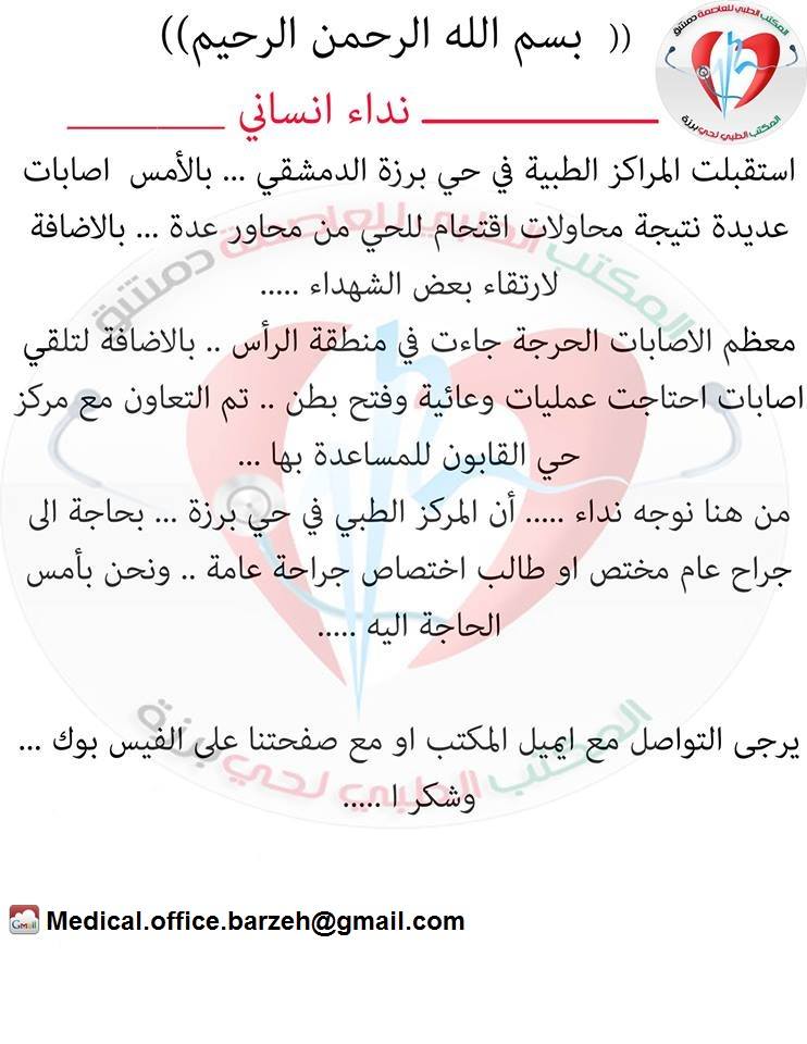 من هنا نوجه نداء ..... أن المركز الطبي في حي برزة ... بحاجة الى جراح عام مختص او طالب اختصاص جراحة عامة .. ونحن بأمس الحاجة اليه .....