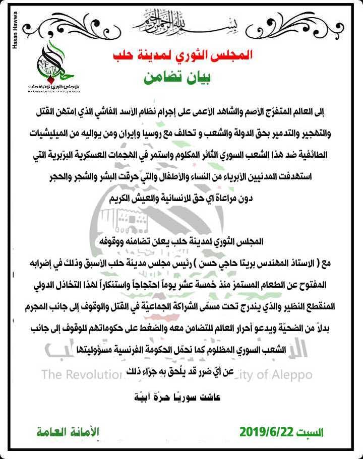 بيان تضامن مع الاستاذ المهندس بريتا حاجي حسن رئيس مجلس مدينة حلب الأسبق وذلك في إضرابه المستمر عن الطعام