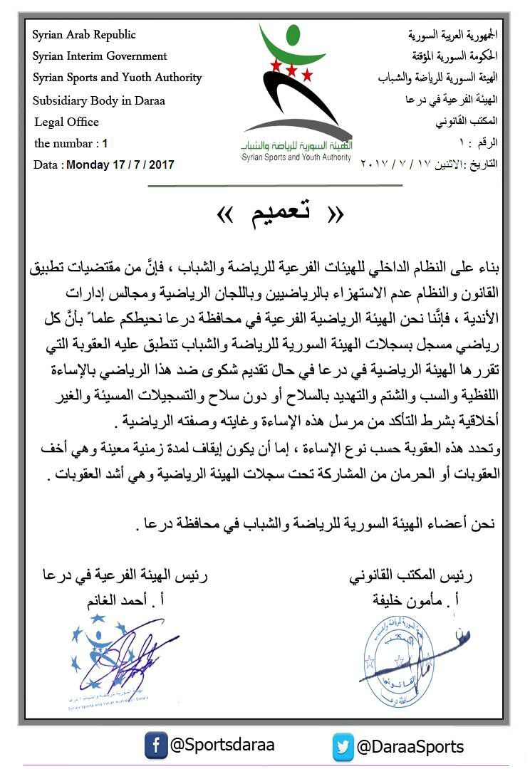 الهيئة السورية للرياضة والشباب الهيئة في درعا تقرر تطبيق قانون محاسبة المستهزئين بالرياضين واللجان الرياضية ومجالس إدارات الأندية