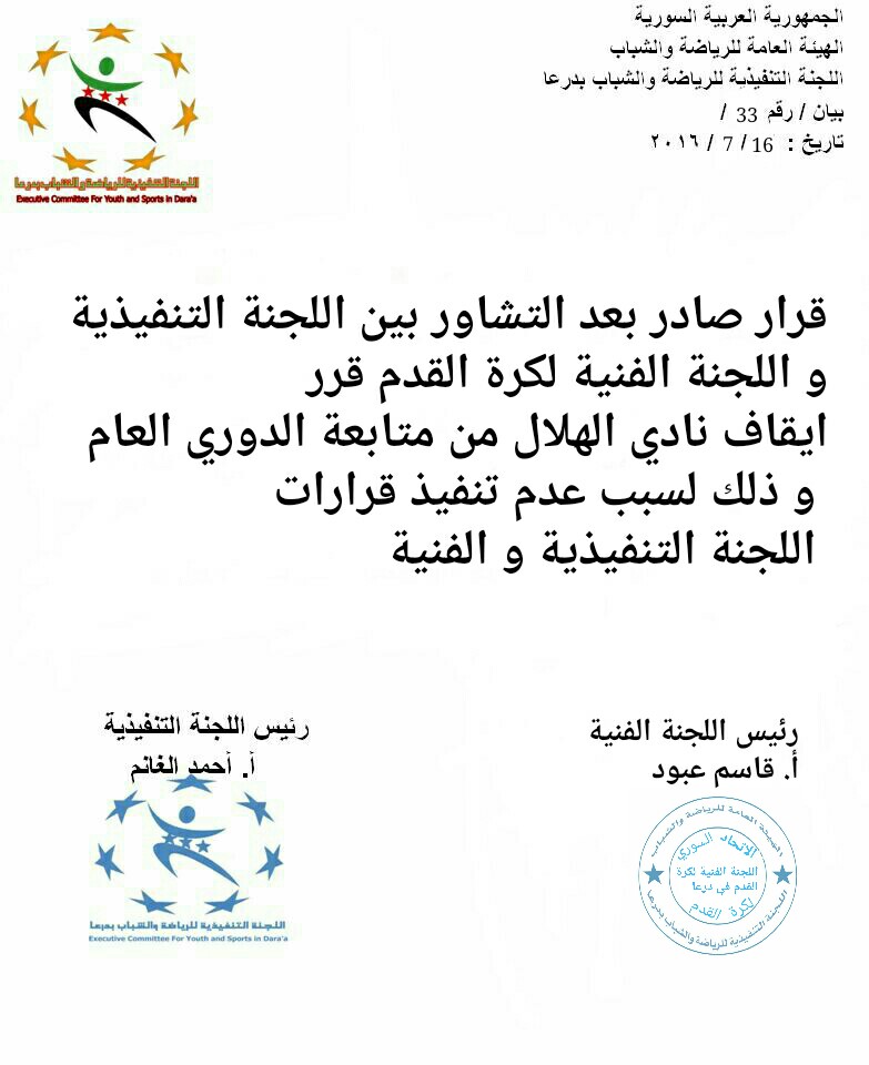 الهيئة السورية للرياضة والشباب في درعا تقرر إيقاف أحد الأندية من متابعة الدوري العام بسبب عدو التزامه بقرارات اللجنة التنفيذية والفنية