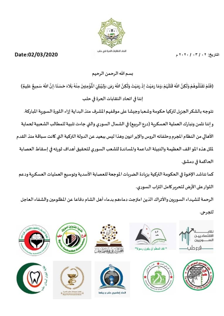 نقابة الاقتصاديين السوريين فرع حلب وكيانات أخرى يباركون العملية العسكرية التركية ضد النظام السوري ( درع الربيع )