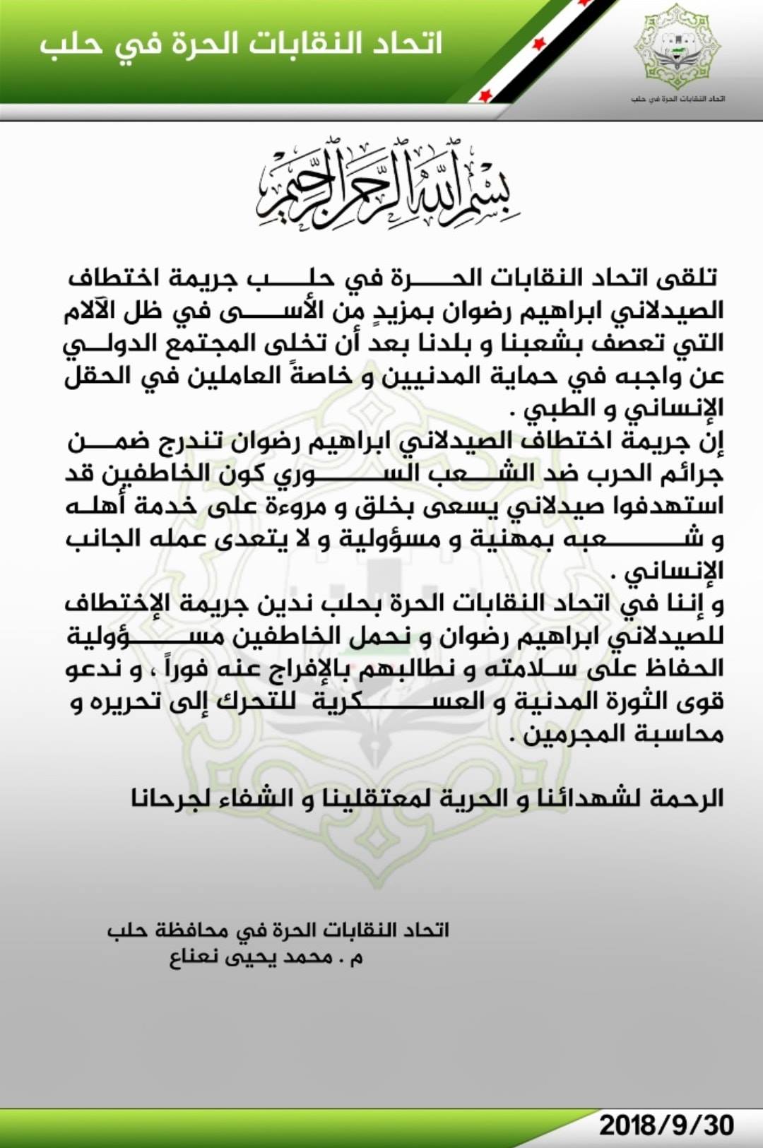 و إننا في اتحاد النقابات الحرة بحلب ندين جريمة الإختطاف للصيدلاني ابراهيم رضوان و نحمل الخاطفين مســــــؤولية الحفاظ على سـلامته و نطالبهم بالإفراج عنه فوراً ، و ندعو قوى الثورة المدنية و العســـــــكرية للتحرك إلى تحريره و محاسبة المجرمين .