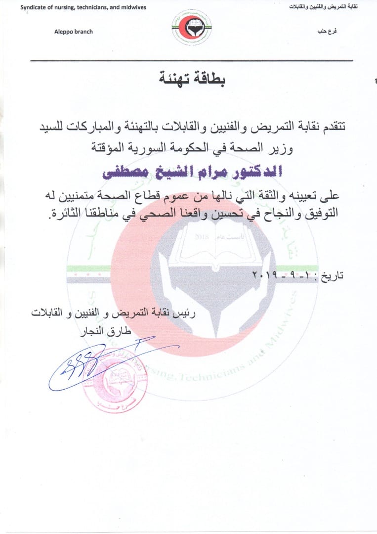 نقابة التمريض والفنيين والقابلات تهنئ الدكتور مرام الشيخ مصطفى تعينه وزيراً للصحة في الحكومة السورية المؤقتة