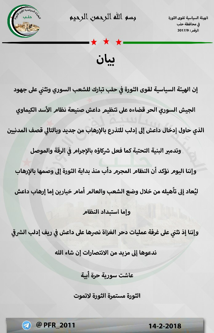 الهيئة السياسية في حلب تبارك للشعب السوري و تثني على جهود الجيش السوري الحر قضاءه على تنظيم الدولة