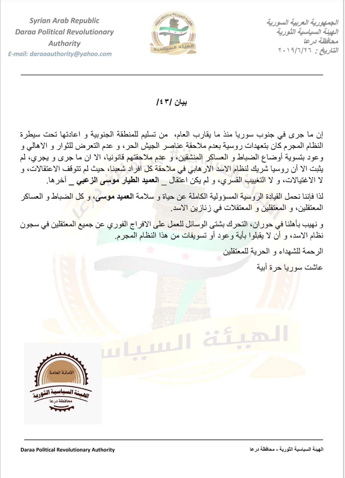 بيان الهيئة السياسية الثورية لمحافظة درعا حول اعتقال الطيار موسى الزعبي وتحميل روسيا المسؤولية عن سلامته
