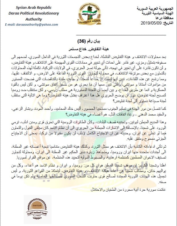 الهيئة السياسية الثورية لمحافظة درعا: هيئة التفاوض.. خداع مستمر
