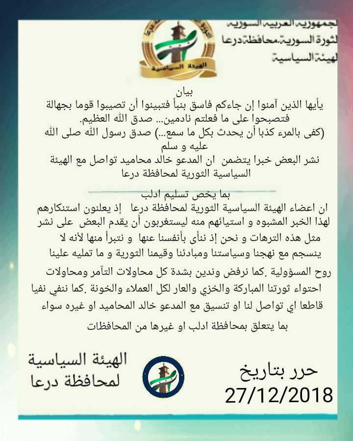 بيان نفي من الهيئة السياسية الثورية لمحافظة درعا حول تواصل المدعو خالد المحاميد معها