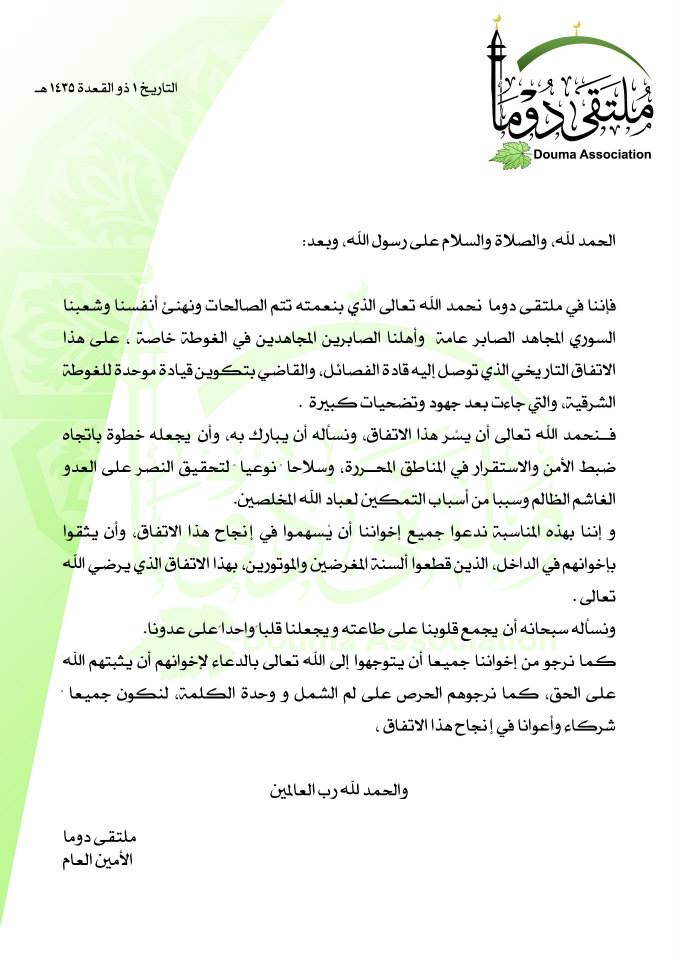 ملتقى دوما يبارك تشكيل القيادة الموحدة للثوار في الغوطة الشرقية