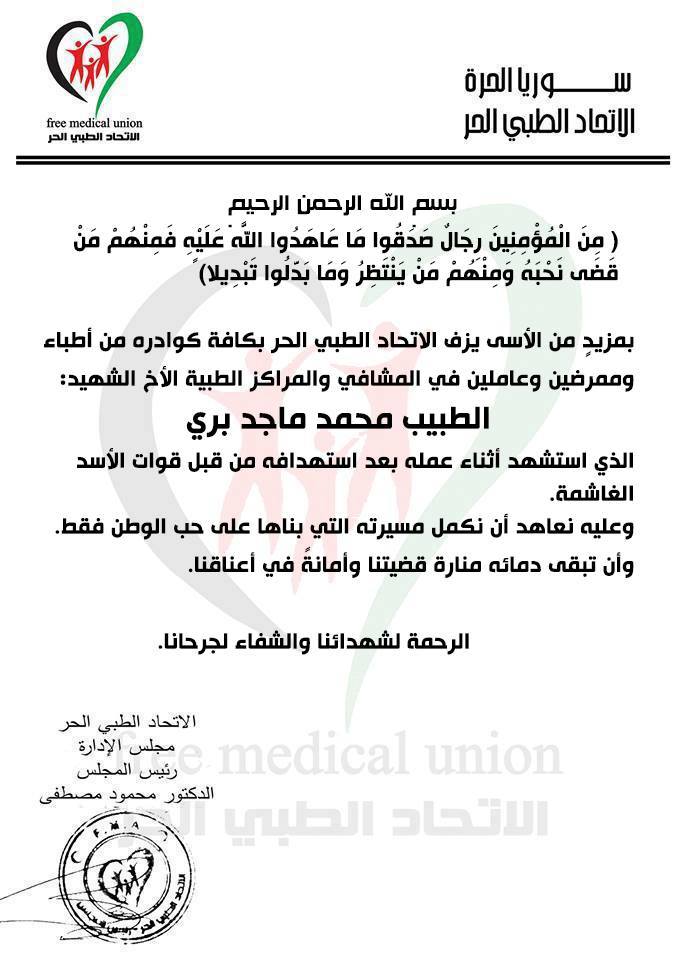 الإتحاد الطبي الحر في مدينة حلب وريفها ينعي الدكتور محمد ماجد بري