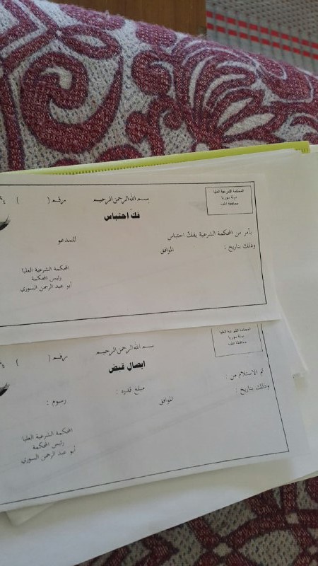 نموذج عن ( إيصال قبض ) و ( فك احتباس ) صادر عن المحكمة الشرعية العليا