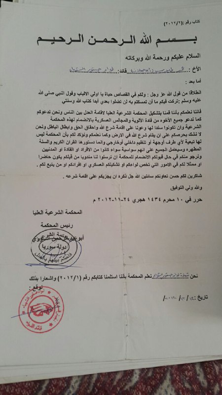 كتاب تعاون بين المحكمة الشرعية العليا ولواء صقور الشهباء