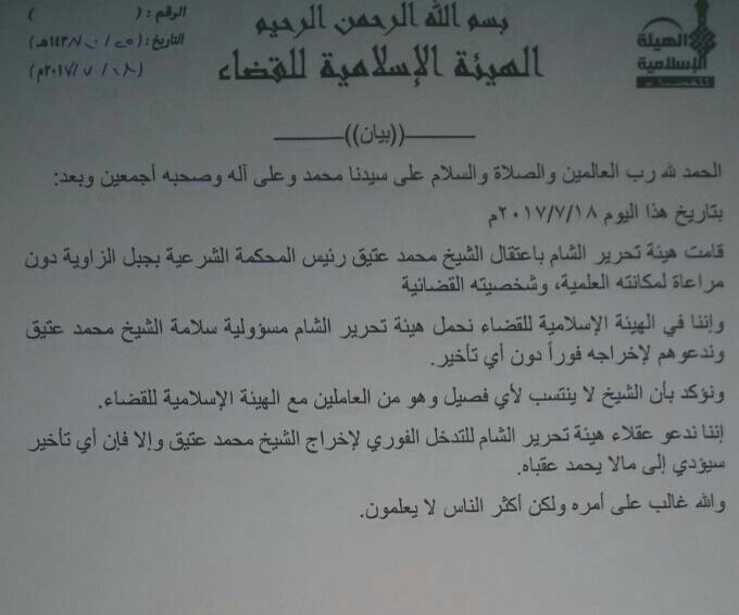 الهيئة الإسلامية للقضاء تدين قيام هيئة تحرير الشام باعتقال الشيخ محمد عتيق رئيس المحكمة الشرعية بجبل الزاوية