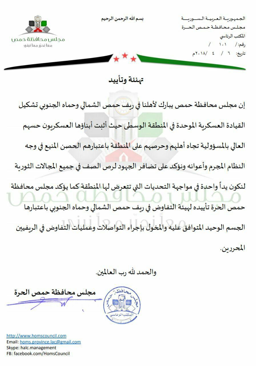 مجلس محافظة حمص الحرة يبارك تشكيل القيادة العسكرية الموحدة في المنطقة الوسطى