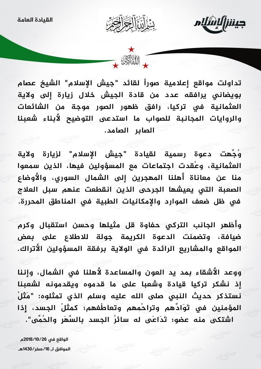 بيان بخصوص ما تداولته مواقع إعلامية بعد زيارة قائد الجيش إلى ولاية العثمانية في تركيا