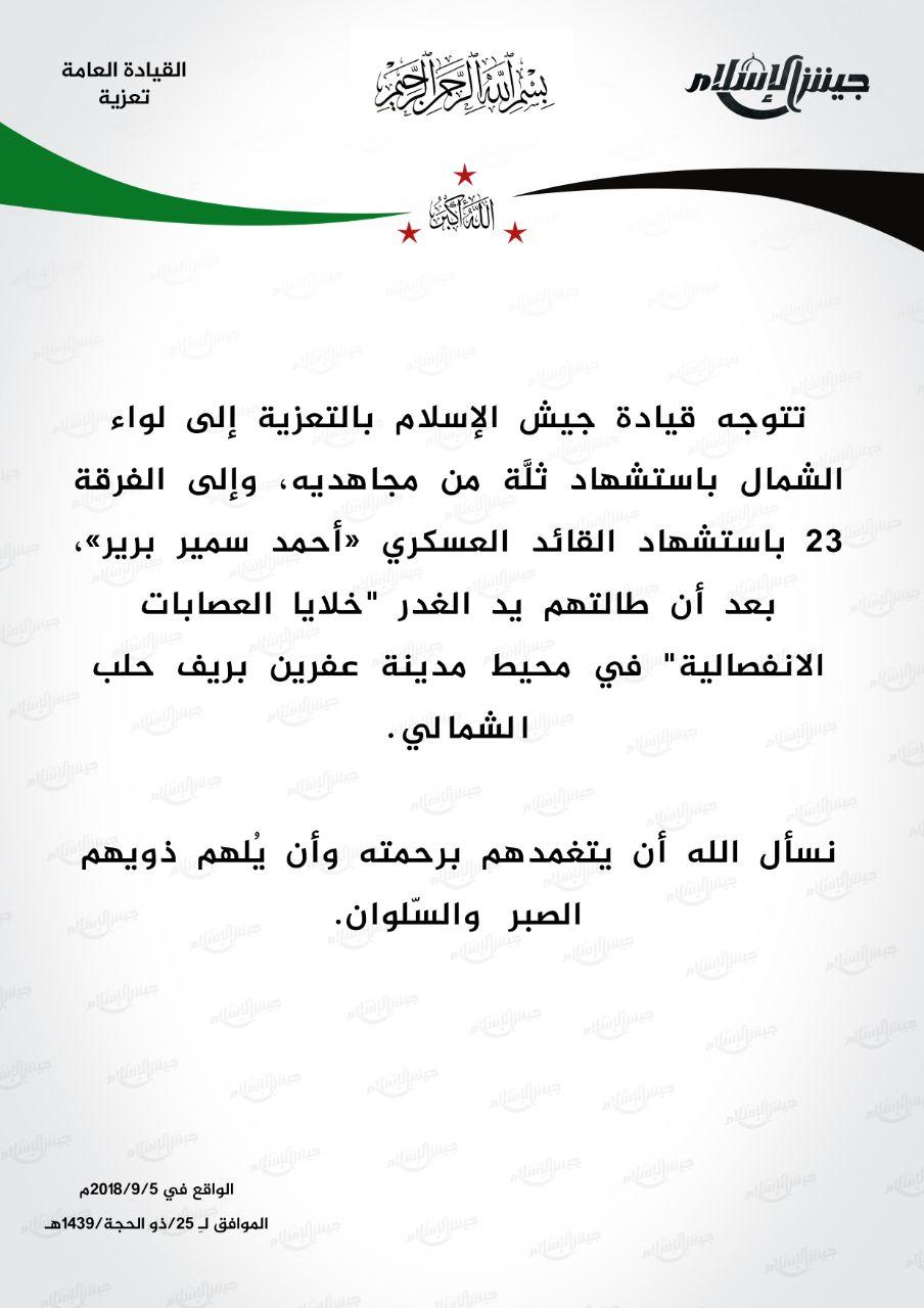 جيش الإسلام يعزي لواء الشمال والفرقة 23 بعدد من مقاتليهم