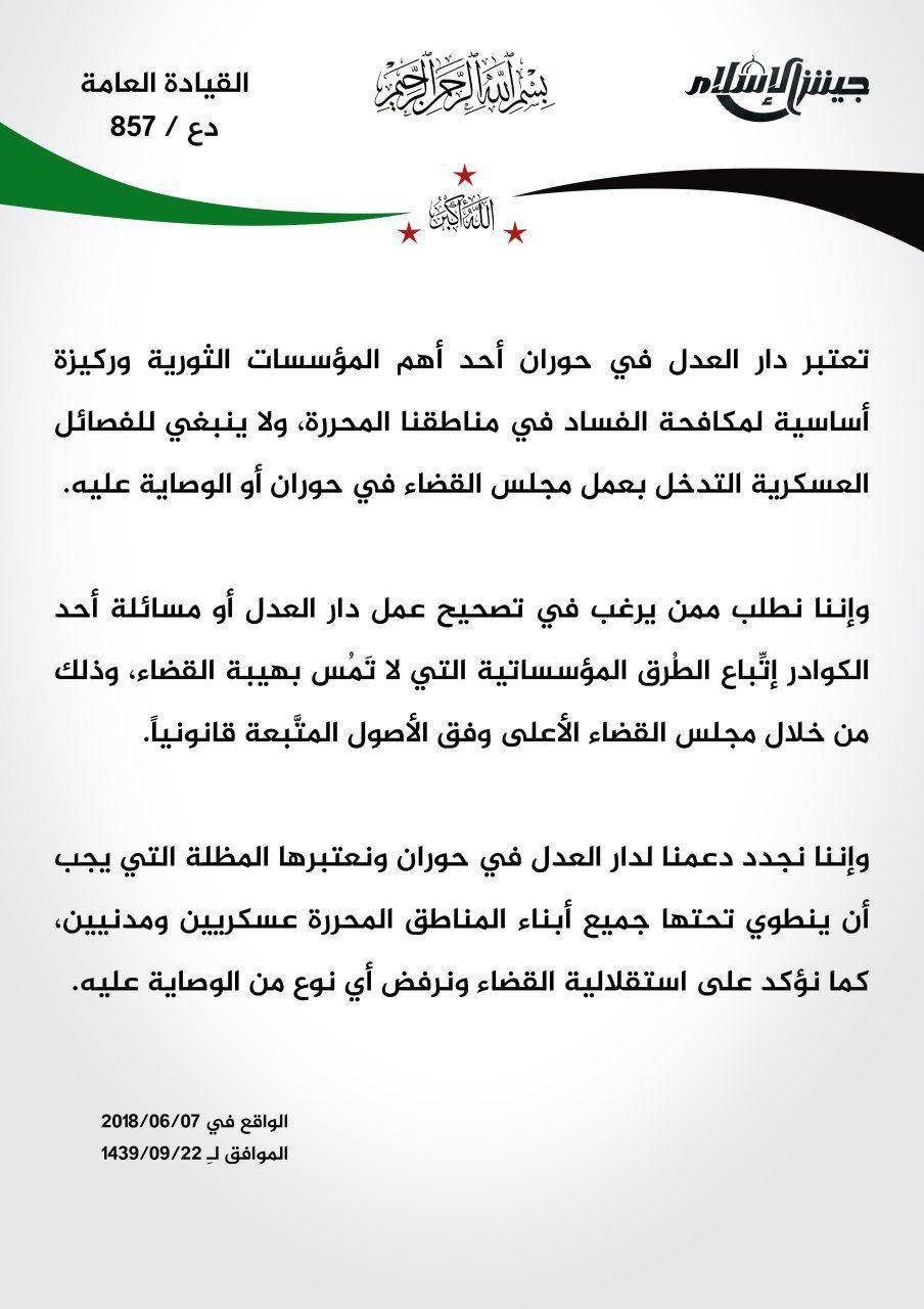 بيان حول رفض جيش الإسلام تدخل الفصائل العسكرية في عمل مجلس القضاء الأعلى في حوران