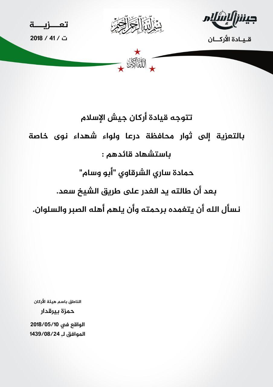 جيش الإسلام يعزي لواء أحرار نوى بقائد اللواء حمادي ساري الشرقاوي
