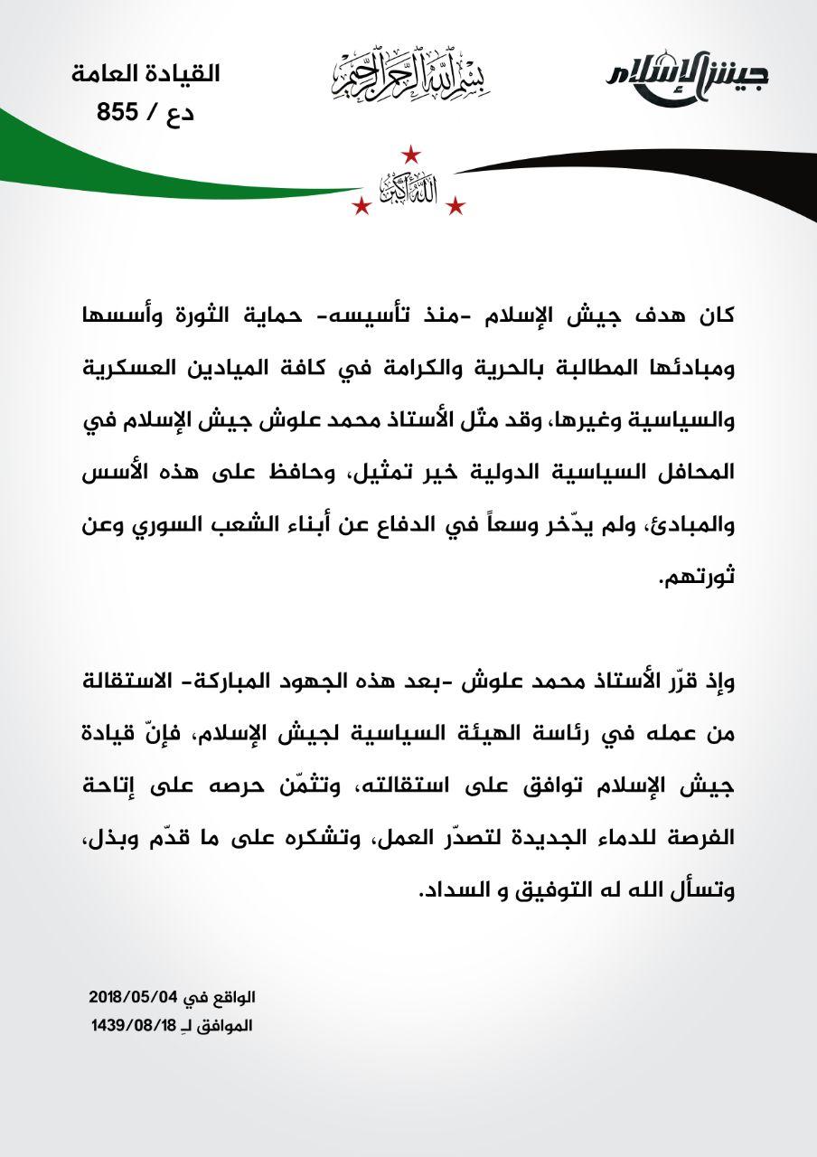 جيش الإسلام يشكر محمد علوش رئيس الهيئة السياسية في جيش الإسلام على جهوده المبذولة منذ بداية الثورة على كافة الصُعد وبجميع المحافل