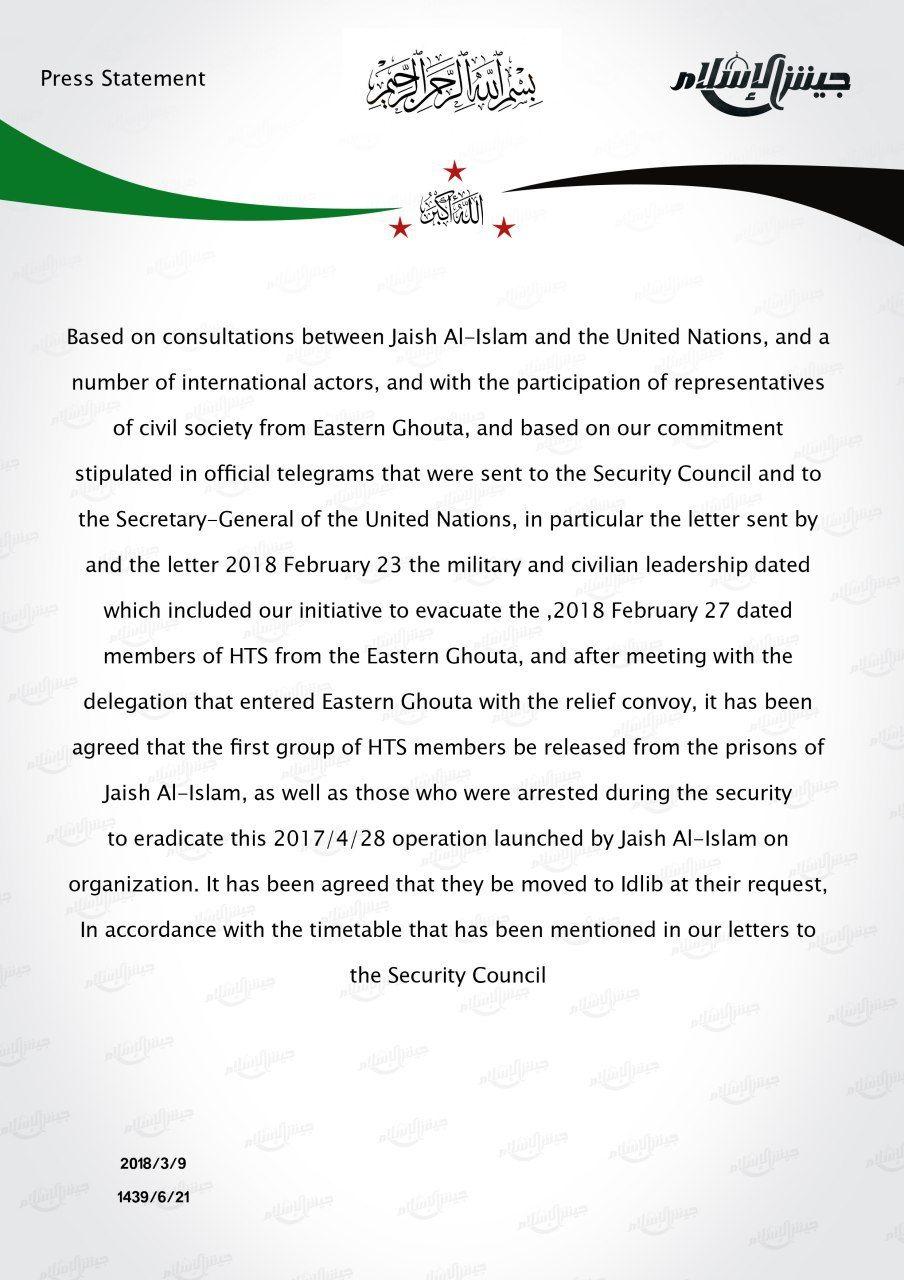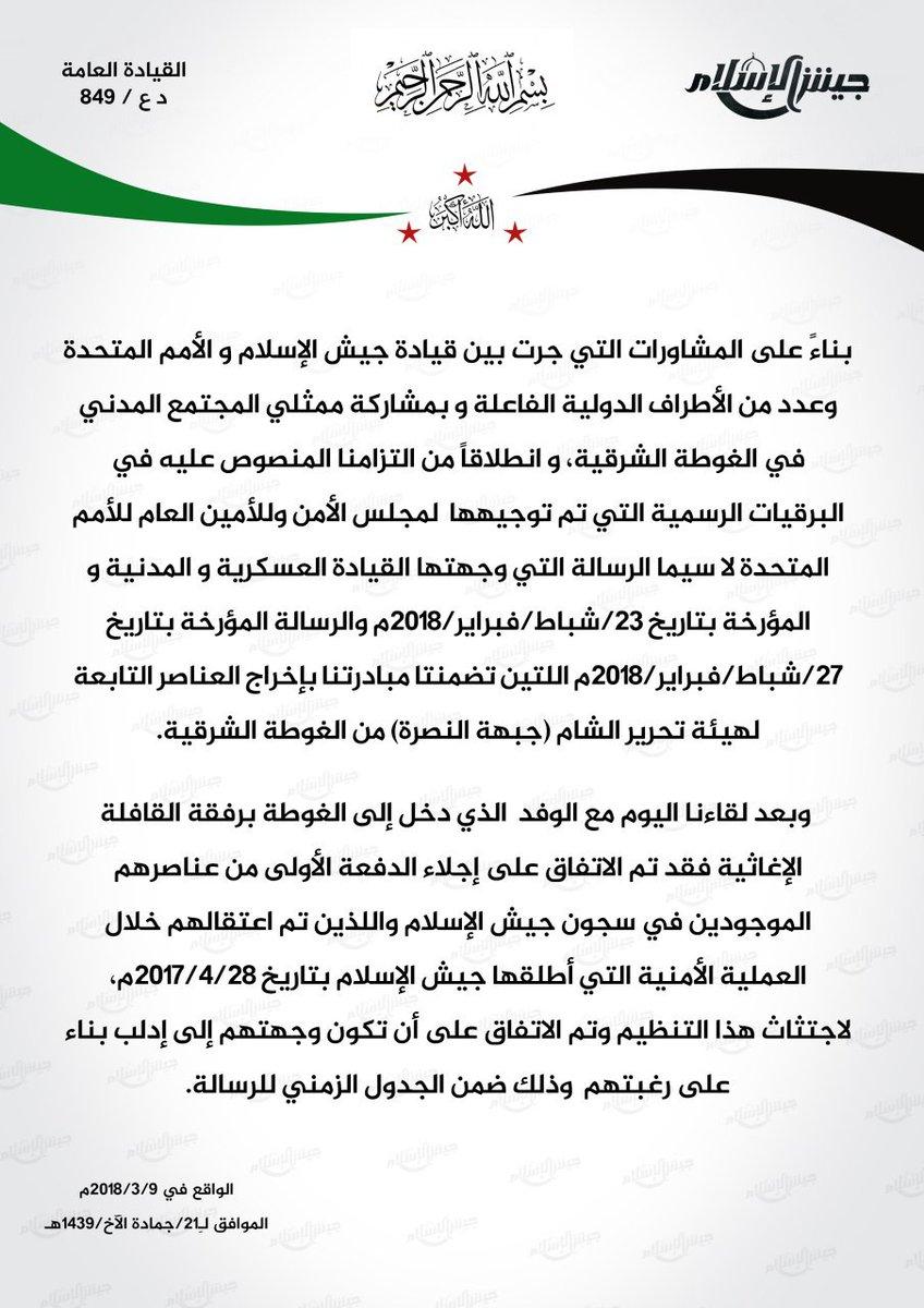 بيان من جيش الإسلام القيادة العامة حول المفاوضات الجارية لإخراج عناصر هيئة تحرير الشام