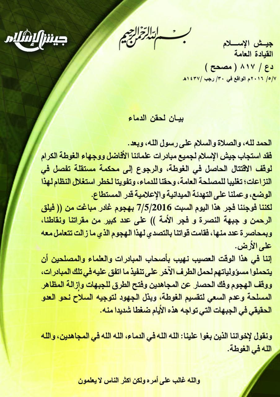 بيان من جيش الإسلام حول الهجوم الذي تتعرض له عدة مقار له في الغوطة من قبل فيلق الرحمن وجبهة النصرة وفجر الأمة