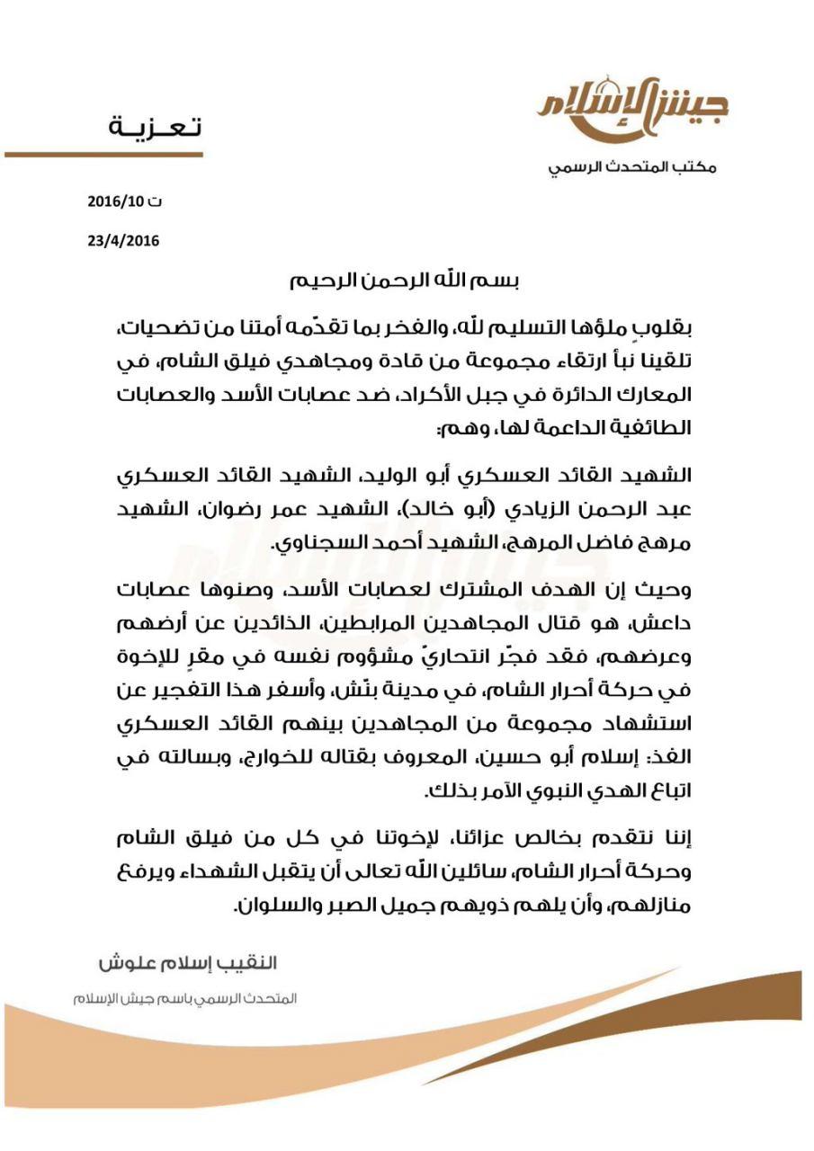 جيش الإسلام يعزي فيلق الشام بعدد من قادته وعناصرة في جبل الأكراد