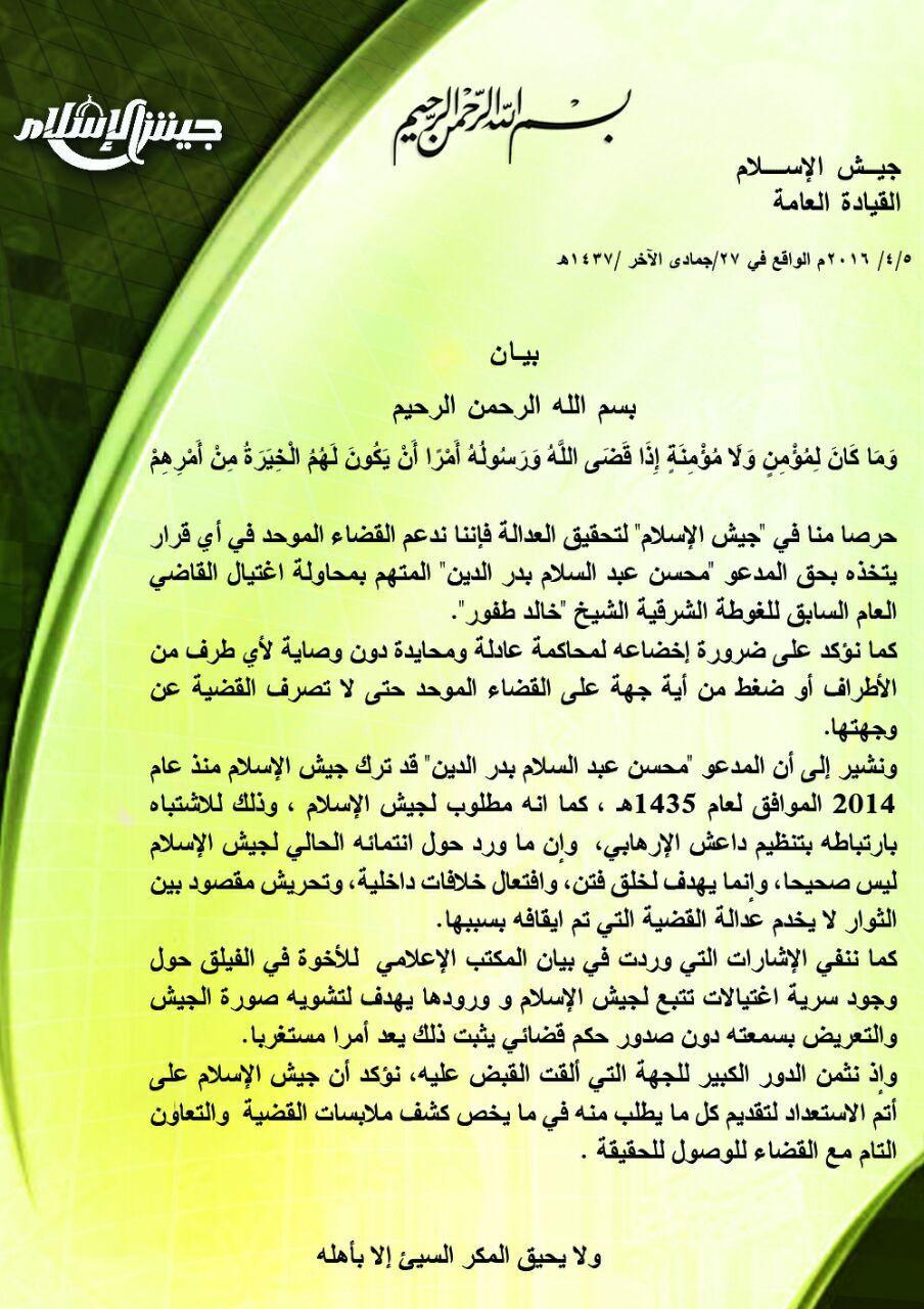 جيش الإسلام يؤكد دعمه للقضاء الموحد في أي قرار يتخذه بحق المدعو محسن عبدالسلام بدر الدين المتهم بمحاولة اغتيال القاضي العام للغوطة السابق خالد طفور