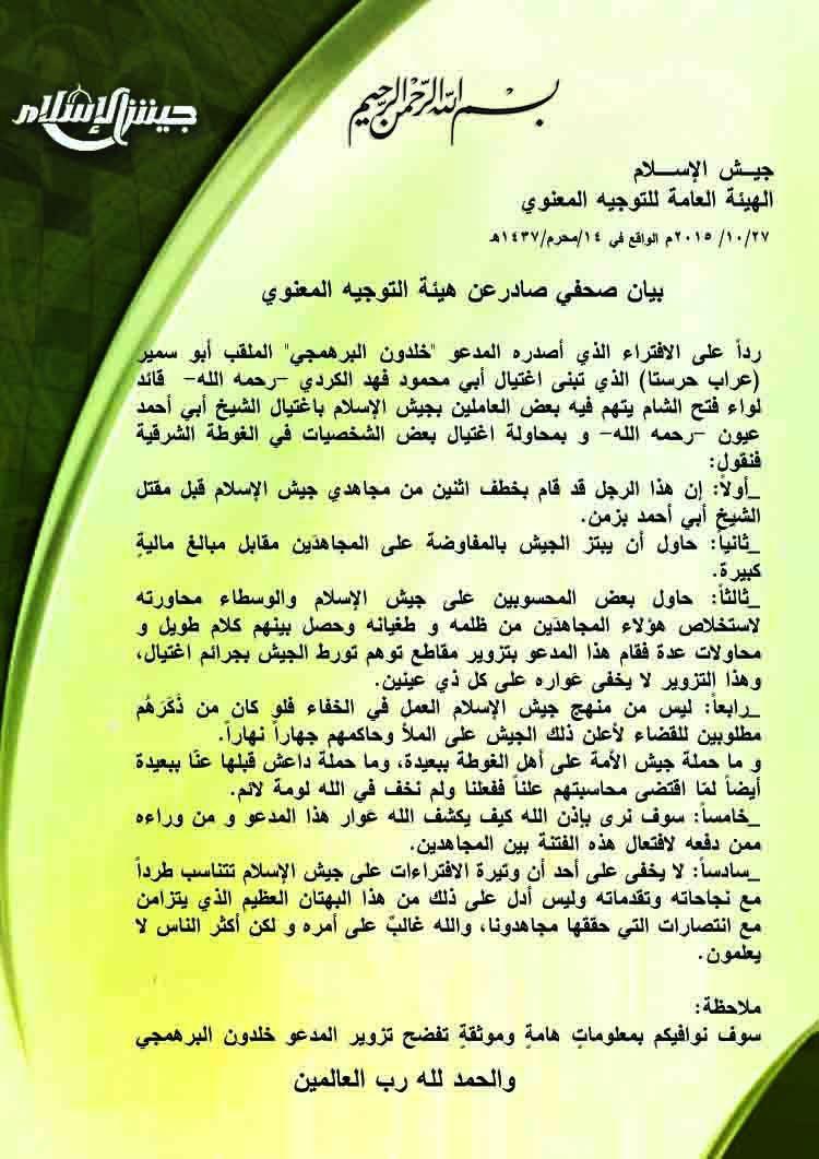 بيان صحفي صادر عن هيئة التوجية المعنوي حول المدعو ( خلدون البرهمجي ) عراب حرستا