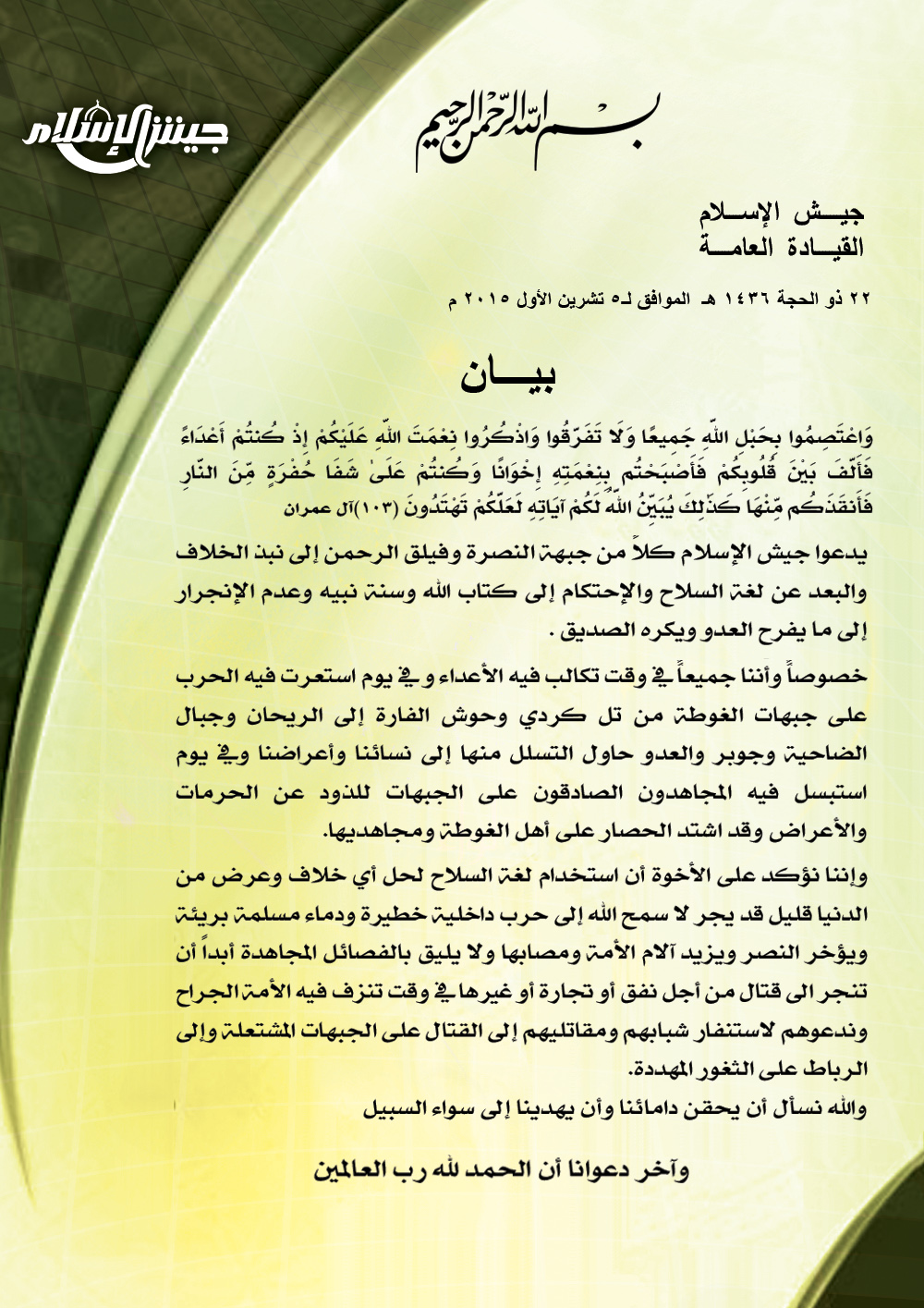بيان جيش الإسلام حول الإعتداء الأخير والأحداث التي جرت بين جبهة النصرة وفيلق الرحمن