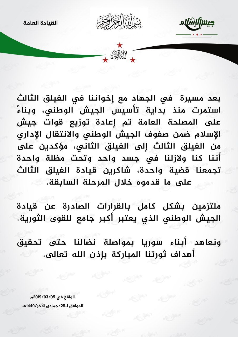 بيان من جيش الإسلام حول انتقاله الإداري من الفيلق الثالث في الجيش الوطني إلى الفيلق الثاني