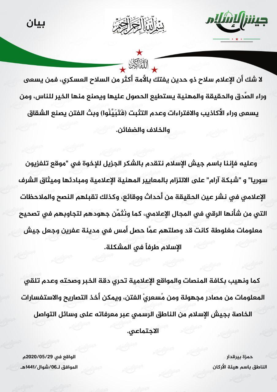جيش الإسلام يشكر موقع تلفزيون سوريا وشبكة آرام على الالتزام بالمعايير المهنية الإعلامية وميثاق الشرف الإعلامي
