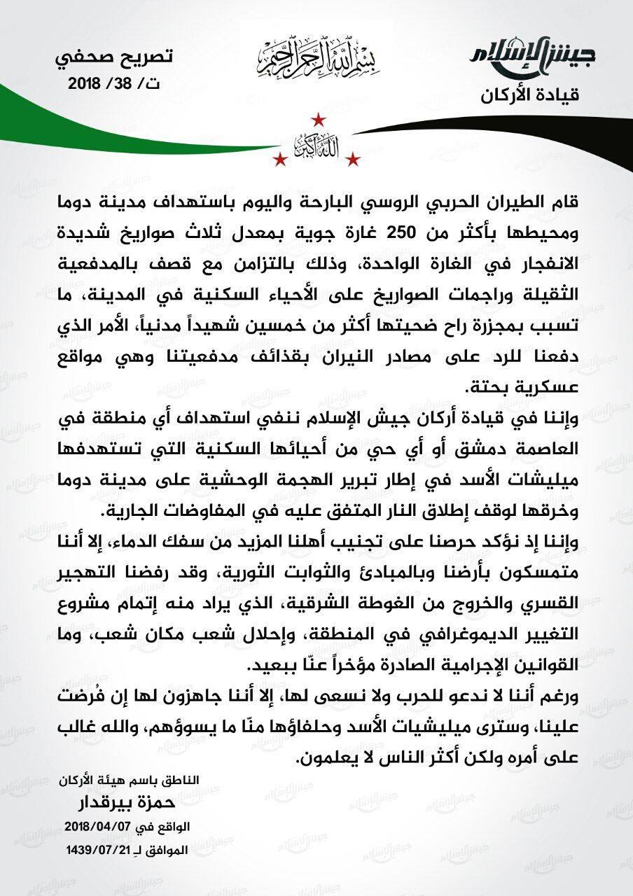 بيان من جيش الإسلام حول استهداف دوما بأكثر من 250 غارة ونفي استهداف العاصمة دمشق
