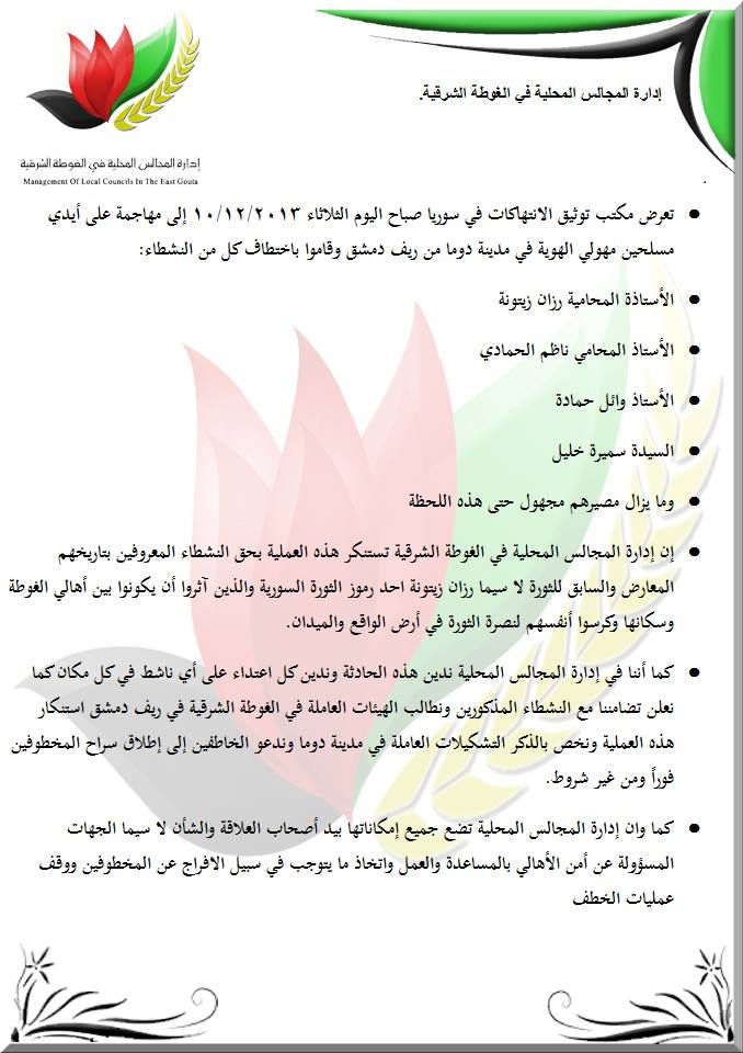 إدارة المجالس المحلية في الغوطة الشرقية تدين وتستنكر الاعتداء على عدة نشطاء ثوريين واختطافهم من قبل مسلحين في مدينة دوما