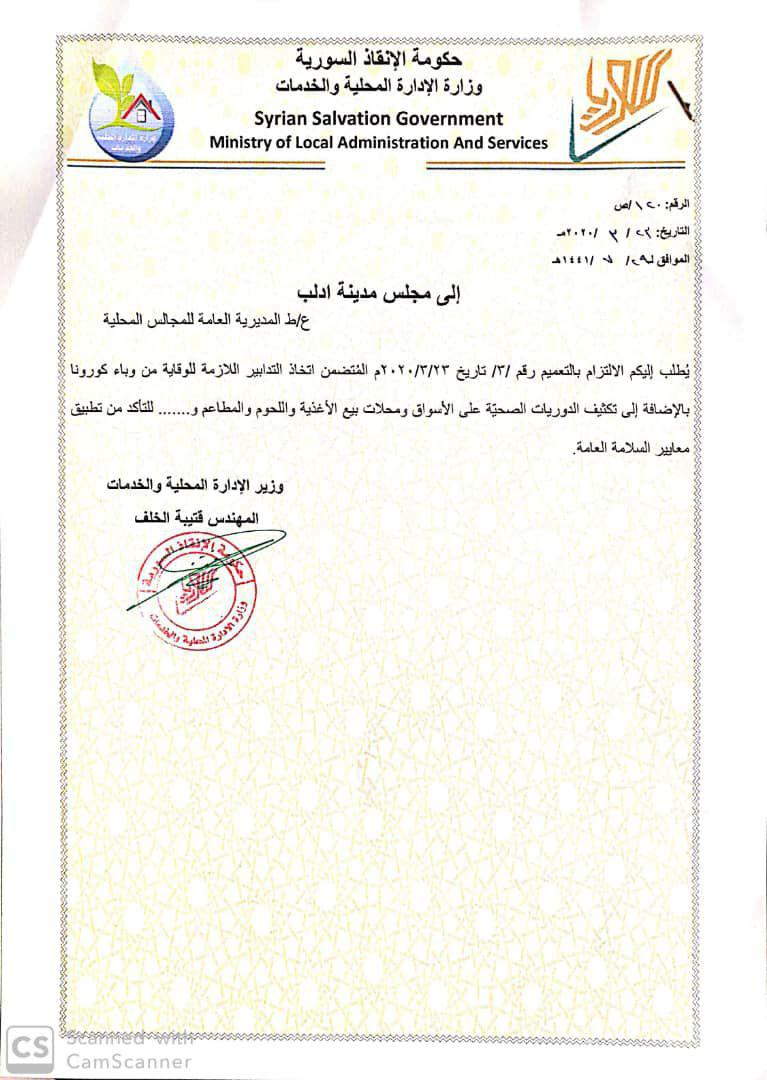 تعميم إلى مجلس مدينة إدلب لاتخاذ التدابير اللازمة للوقاية من وباء كورونا وتكثيف الدوريات الصحية على الأسواق