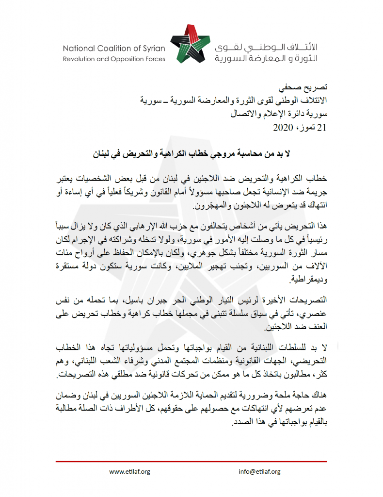 الائتلاف الوطني: لا بد من محاسبة مروجي خطاب الكراهية والتحريض في لبنان