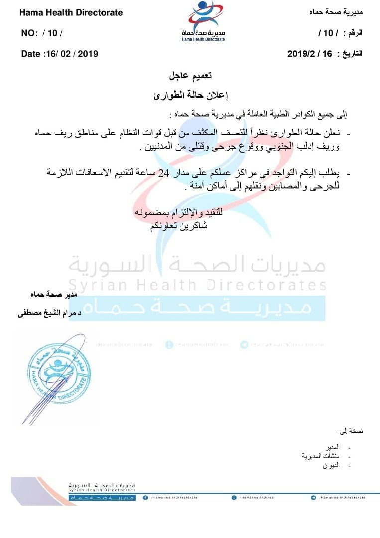 بيان لمديرية الصحة في حماة يرفع فيه حالة الطوارئ بسبب القصف الممنهج لقوات النظام وحليفها الروسي على ريفي حماة الشمالي و الغربي