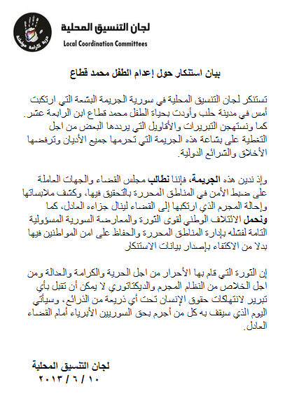 تستنكر لجان التنسيق المحلية في سورية الجريمة البشعة التي ارتكبت أمس في مدينة حلب وأودت بحياة الطفل محمد قطاع ابن الرابعة عشر.