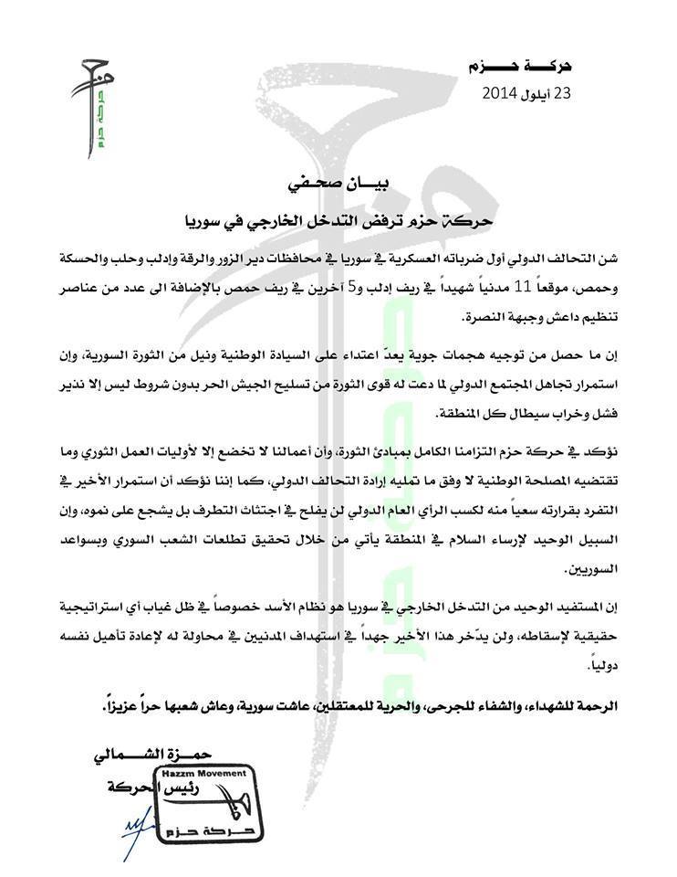 حركة حزم ترفض التدخل الخارجي في سوريا
