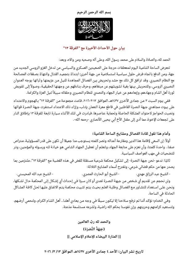 بيان صادر عن جبهة النصرة بخصوص الأحداث الأخيرة في ريف إدلب مع الفرقة 13