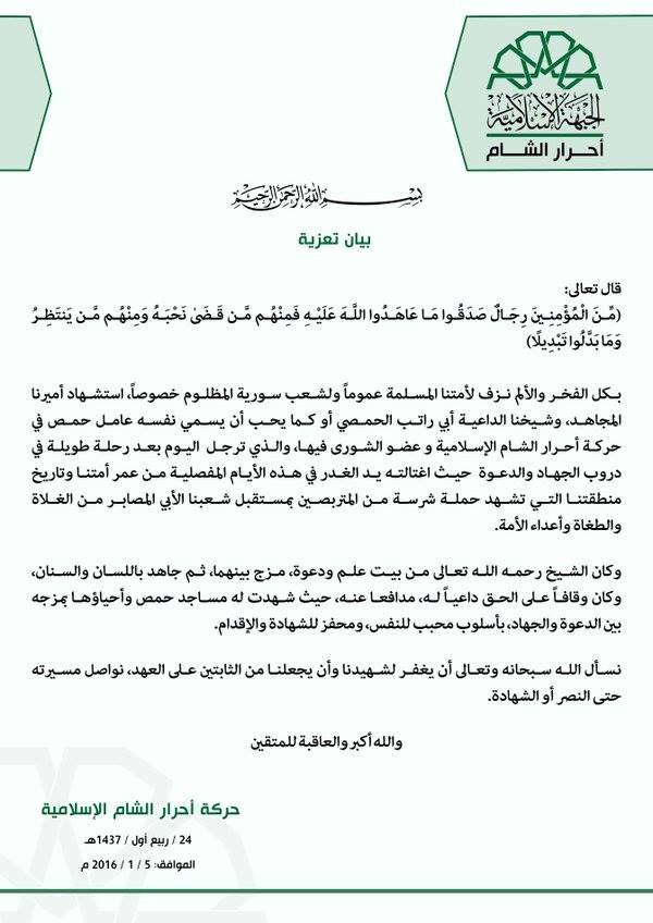 بيان من حركة عن حركة أحرار الشام الإسلامية تنعي من خلاله أبي راتب الحمصي الذي قضى برصاص مجهولين في ريف حمص