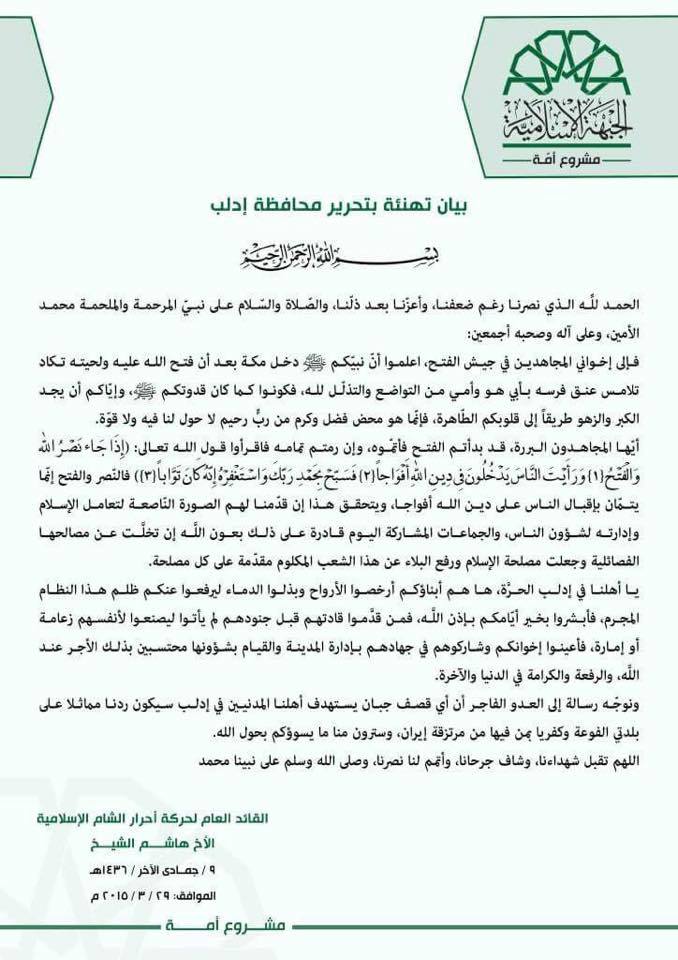 بيان هام من الجبهة الإسلامية تدعو فيه للتعاون في ادارة ادلب والابتعاد عن الزعامات والامارات
