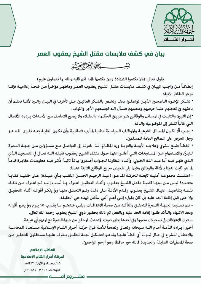 بيان "حركة أحرار الشام" في كشف ملابسات مقتل الشيخ يعقوب العمر