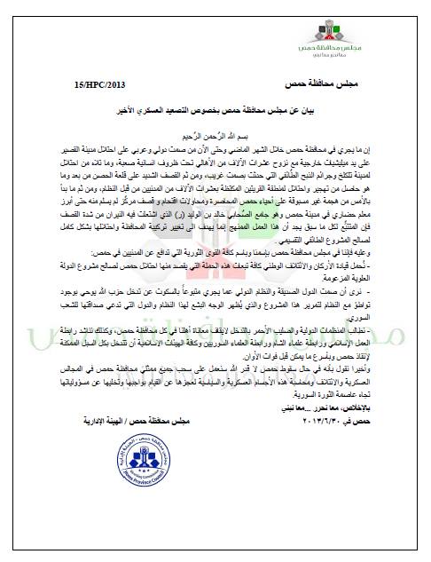 وعليه فإننا في مجلس محافظة حمص بإسمنا وباسم كافة القوى الثورية التي تدافع عن المدنيين في حمص: