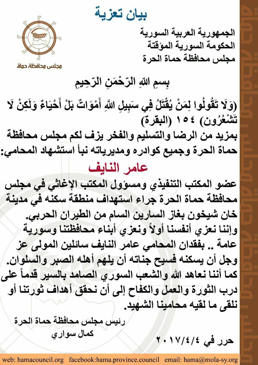 مجلس محافظة حماة ينعي المحامي عامر النايف عضو المكتب التنفيذي في مجزرة الكيماوي في مدينة خان شيخون