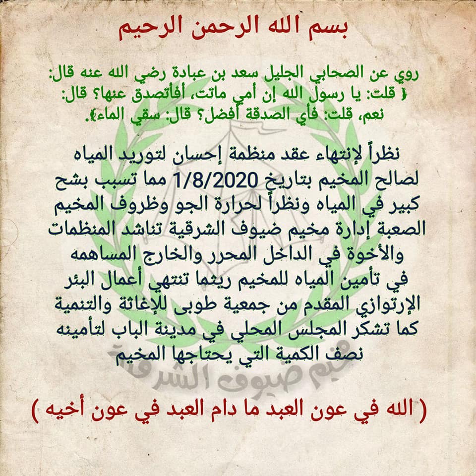 إدارة مخيم ضيوف الشرقية تناشد المنظمات تأمين احتياج المخيم من المياه