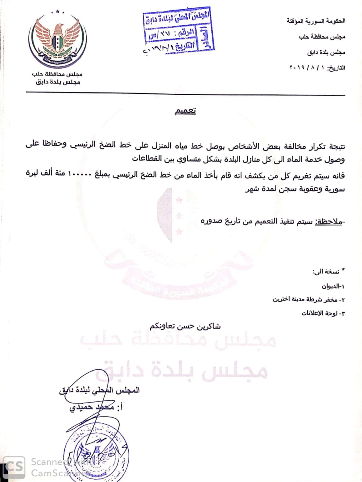 تعميم من قبل المجلس المحلي لبلدة دابق بتغريم كل من يخالف بوصل المياه إلى المنازل من خط الضخ الرئيسي