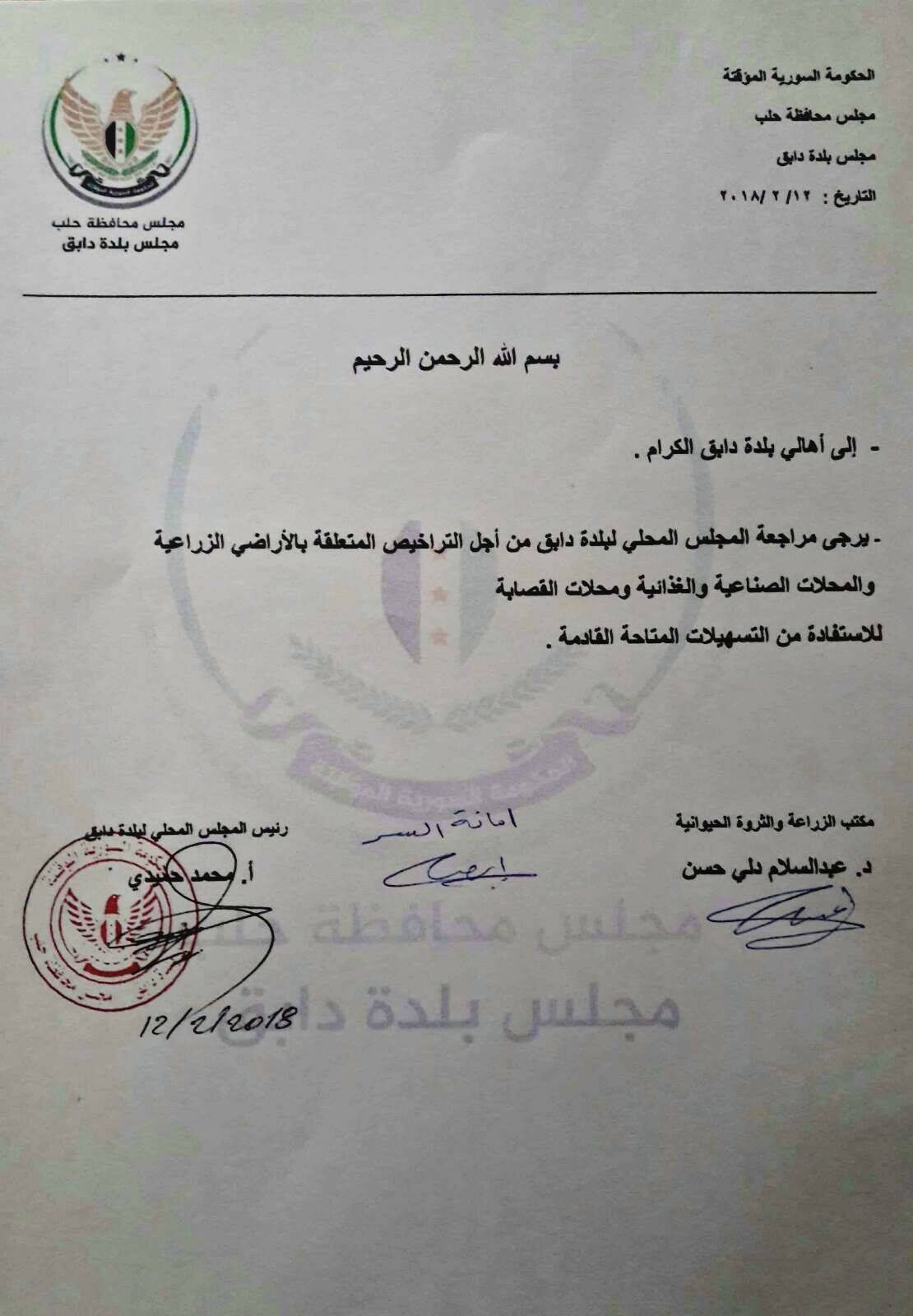 المجلس المحلي لبلدة دابق يطلب من الأهالي مراجعة المجلس المحلي للبلدة من اجل التراخيص المتعلقة بالاراضي الزراعية والمحلات الصناعية