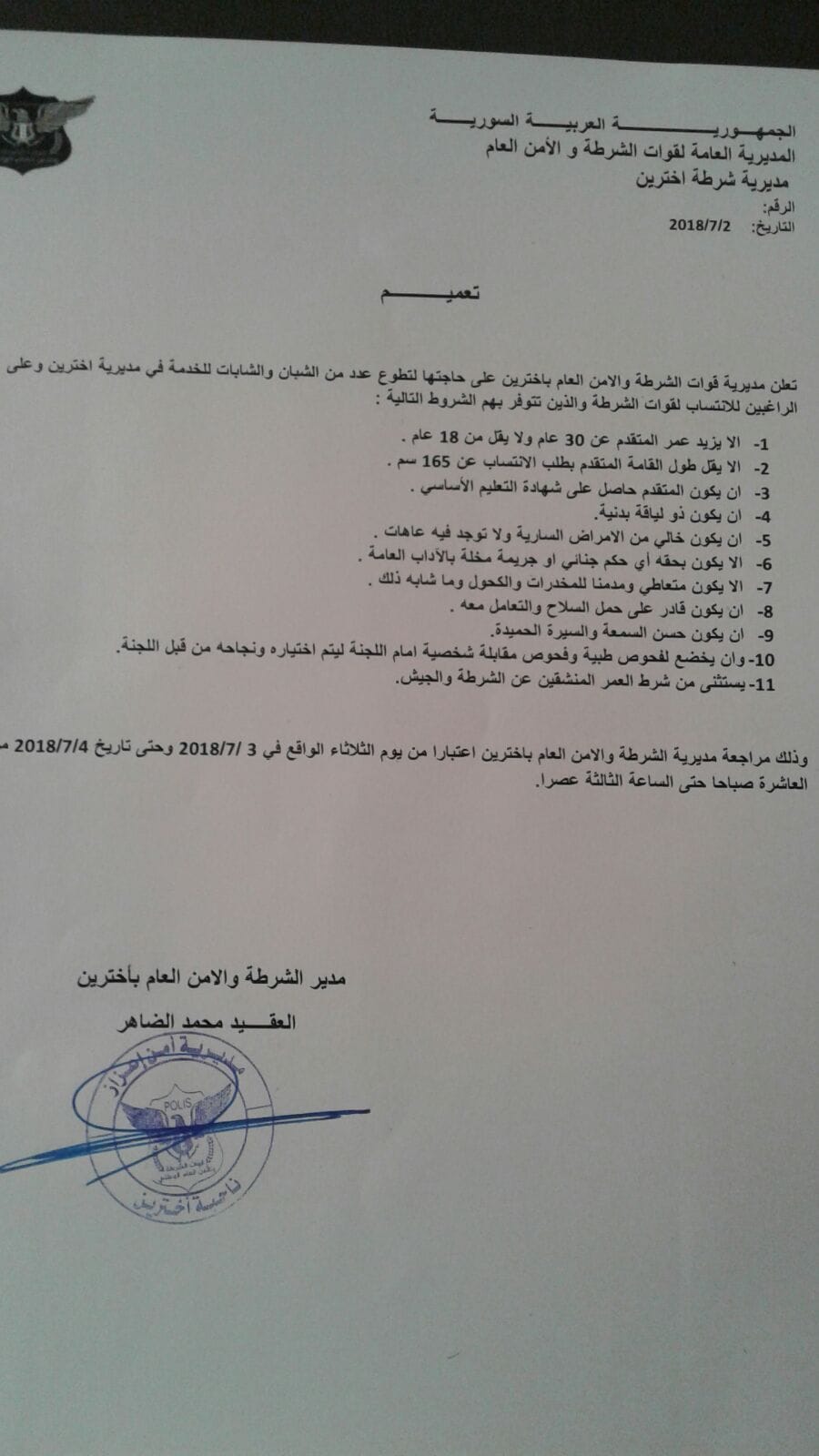 إعلان قوات الشرطة والامن العام الوطني في أخترين عن حاجتها لمتطوعين من الشبان والشابات