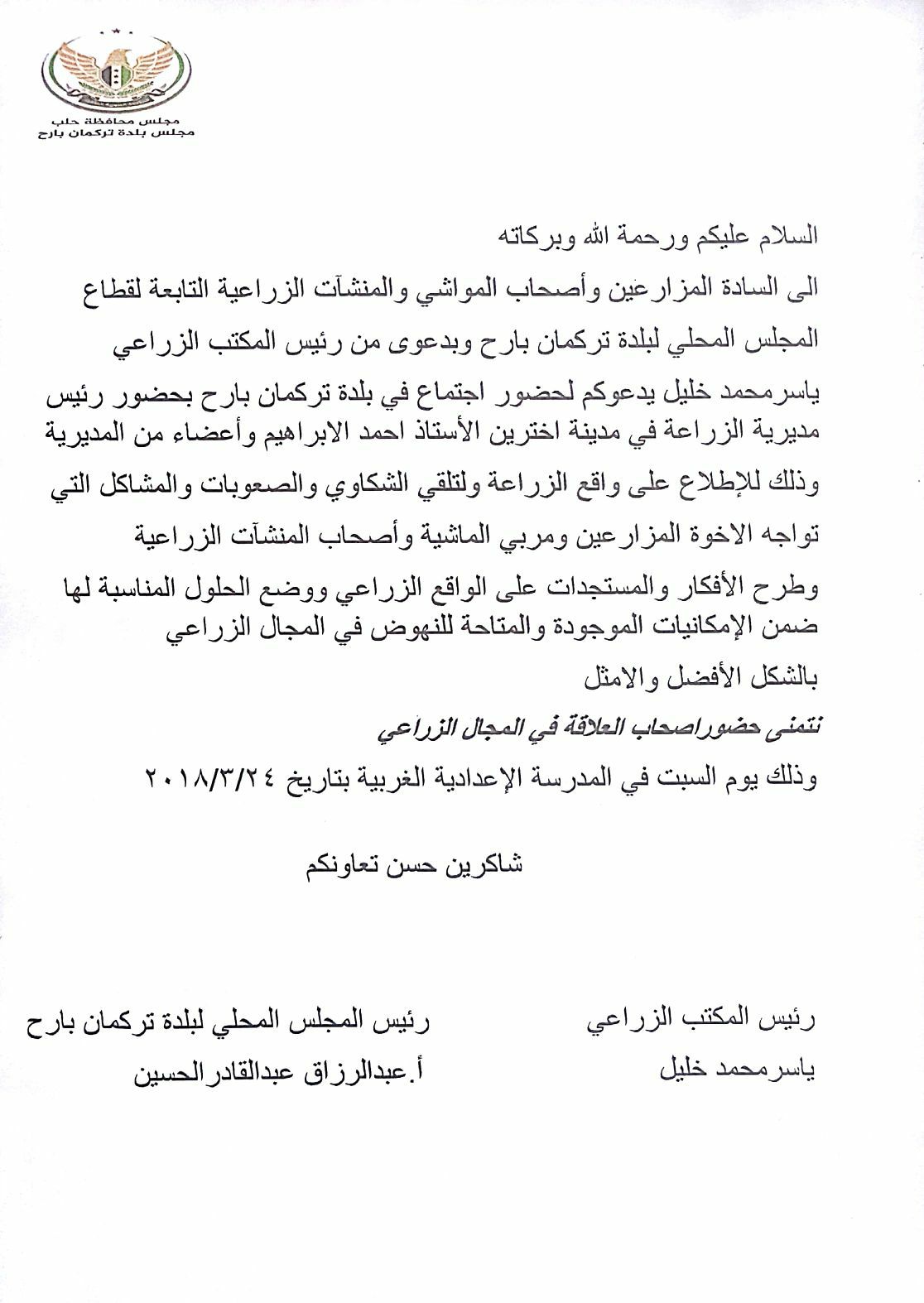 دعوة من المجلس المحلي لبلدة تركمان بارح يدعو فيه المزارعين وأصحاب المنشآت الزراعية و أصحاب المواشي لحضور اجتماع للإطلاع على واقع الزراعة والشكاوي الموجودة